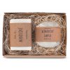 Dárková sada jednoho mýdla z kategorie Přírodní a jednoho heřmánkového šampuku v papírové krabičce vyložené dřevitou vatou.