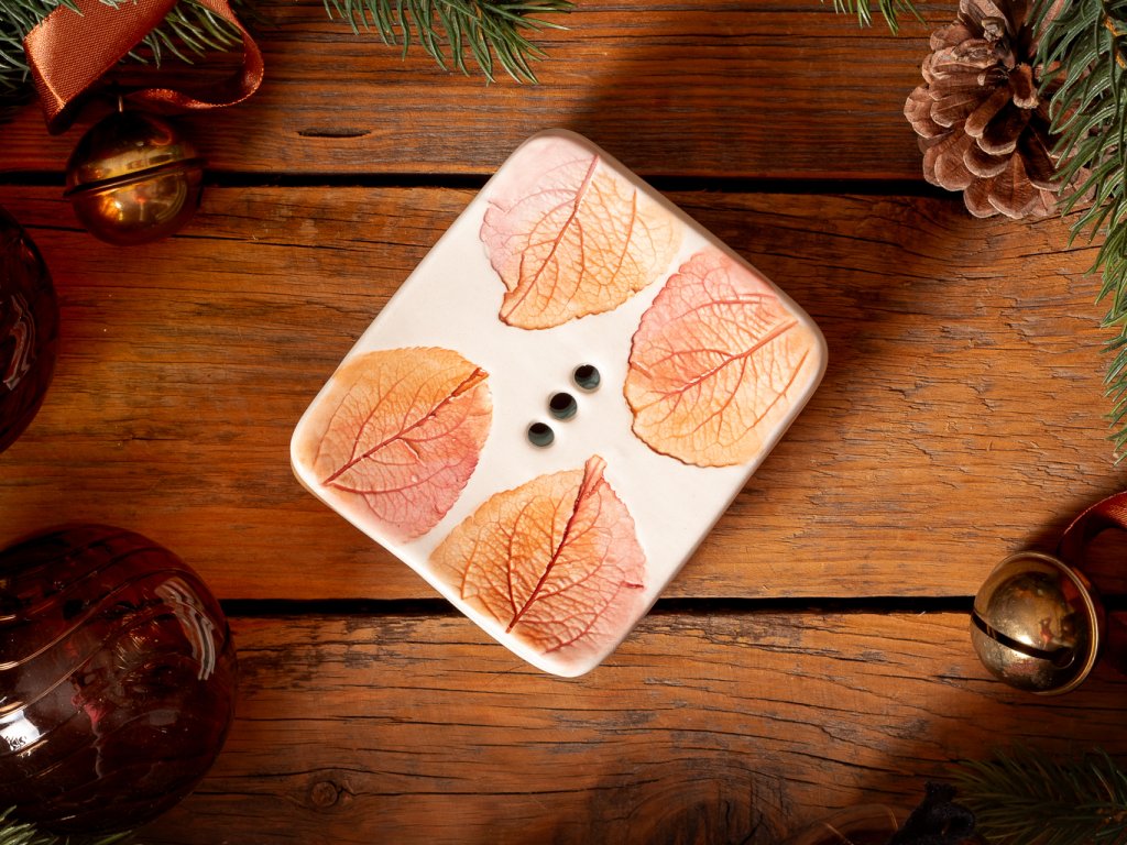 Keramická ručně vyrobená mýdlenka s přírodním vzorem listů v jemné zelené, oranžové nebo modro-červené barvě z šumavské keramické dílny. Keramická mýdlenka je nejen praktickým pomocníkem, ale díky jejímu zdobení také dotváří design vaší koupelny. Tuto designovou variantu zdobí plastický design v podobě listů.