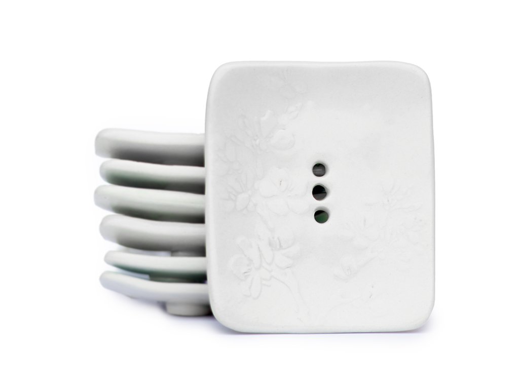 Keramická ručně vyrobená mýdlenka s květinovým vzorem sakury v jemné bílé nebo modré barvě z šumavské keramické dílny. Keramická mýdlenka je nejen praktickým pomocníkem, ale díky jejímu zdobení také dotváří design vaší koupelny. Tuto designovou variantu zdobí plastický design v podobě sakury.