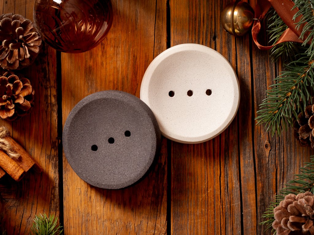 Minimalistická kulatá mýdlenka s hrubým povrchem je ručně odlita z lehkého betonu. Dostat ji můžete v 6 barevných variantách - bílá, šedá, černá, modro-béžová, fialovo-růžová nebo žluto-zelená.Protože jde o autorskou tvorbu a každý kus je originál, může se mírně lišit proti fotografii.