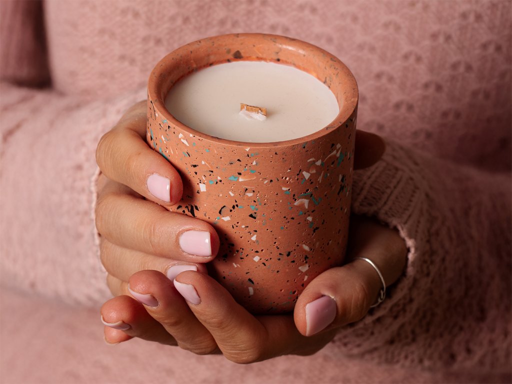 Svíčka má dřevěný bukový knot vyrobený v EU, který jemně praská a navozuje příjemnou atmosféru. Na spodní straně je opatřená korkovým kolečkem, které brání poškrábání povrchu stolu. Svíčka je vylitá do obalu z kompozitní směsi, který ručně vyrábíme v naší dílně z ekologického kompozitního materiálu na vodní bázi, který neobsahuje rozpouštědla ani těkavé organické látky a je odolný vůči ohni. Vizuálně připomíná velmi lehký beton. Každý obal vzniká ručně v naší dílně – žádná sériová výroba, jen poctivé řemeslo. Díky ruční výrobě je každý kus originál, a proto se na něm mohou vyskytnout drobné nedokonalosti v podobě bublinek, které ale nejsou na závadu.