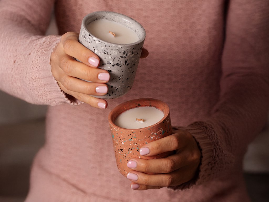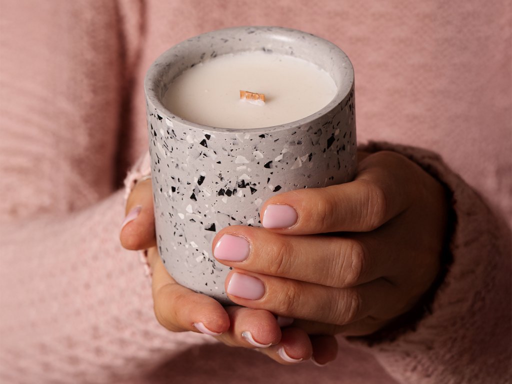 Svíčka má dřevěný bukový knot vyrobený v EU, který jemně praská a navozuje příjemnou atmosféru. Na spodní straně je opatřená korkovým kolečkem, které brání poškrábání povrchu stolu. Svíčka je vylitá do obalu z kompozitní směsi, který ručně vyrábíme v naší dílně z ekologického kompozitního materiálu na vodní bázi, který neobsahuje rozpouštědla ani těkavé organické látky a je odolný vůči ohni. Vizuálně připomíná velmi lehký beton. Každý obal vzniká ručně v naší dílně – žádná sériová výroba, jen poctivé řemeslo. Díky ruční výrobě je každý kus originál, a proto se na něm mohou vyskytnout drobné nedokonalosti v podobě bublinek, které ale nejsou na závadu.